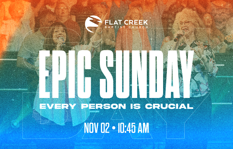 Epic Sunday – Every Person Is Crucial + Add to Google Calendar + iCal / Outlook export 00 days 00 hours 00 minutes 00 seconds Date Nov 02 2025 Time 10:45 am Location Flat Creek Baptist Church 161 Flat Creek Trail Fayetteville GA 30214 Category Adults Organizer Josh Saefkow Phone (770) 487-4890 Email danab@flatcreekbaptist.org Share this event